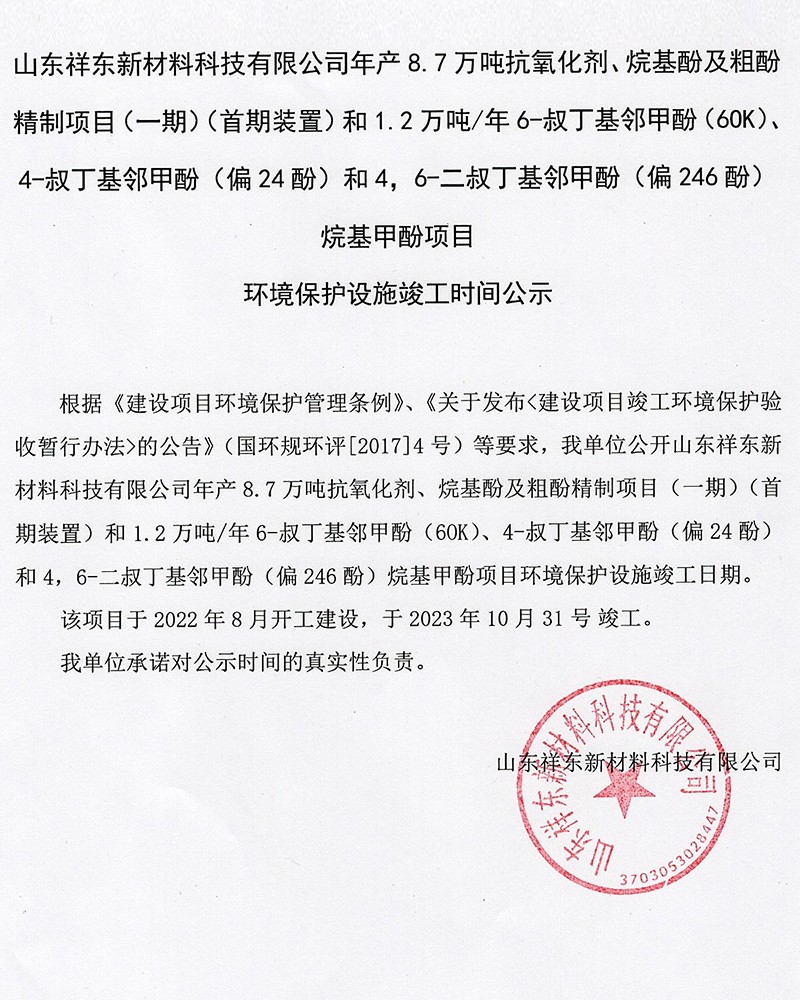 烷基甲酚項(xiàng)目環(huán)境保護(hù)設(shè)施竣工時(shí)間公示