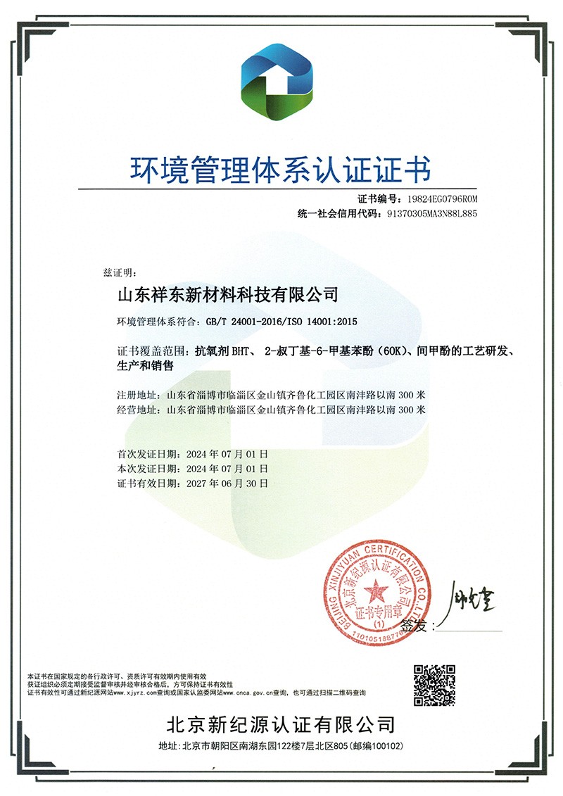 山東祥東新材料科技有限公司1.2萬噸/年6-叔丁基鄰甲(60K)、4-叔丁基鄰甲酚(偏 24 酚)和 4,6-二叔丁基鄰甲酚(偏 246 酚)烷基甲酚項目竣工環(huán)境保護(hù)驗收監(jiān)測報告